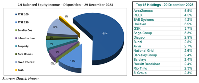 The Balanced Equity Income portfolio gained over the final quarter taking it to positive for the year as a whole. The dividend paid at the end of November was around 12.5% higher than last year’s payment, putting the ‘B’ income units on a historic yield of 3.8% at the end of December. The overall disposition shows little change though there were more transactions than usual this time, right.