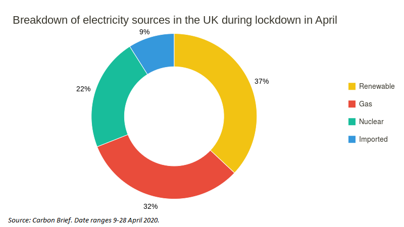 In April the UK broke a new record: the longest continuous period of time using coal-free power generation since the Industrial Revolution. As a result, renewable energy accounted for 37% of electricity supply, a significant contrast to 2012, which saw coal supply 43% and renewables only making up 7% (see pie chart, right). This increase in supply of renewable energy was aided by an almost 20% decrease in demand for electricity, as well as powerful winds and an abundance of sunshine.