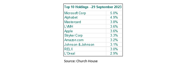 The top holdings are little changed though the positions have shuffled a touch.  Alphabet was strong after their second quarter earnings report in July, and Mastercard were marginally ahead.  These two knocked LVMH (Louis Vuitton etc.) back to fourth place after a rough quarter for the luxury goods companies, worrying about the Chinese non-recovery, which also knocked Hermès.  None of this is apparent in LVMH’s figures, which showed double-digit revenue growth in all areas except for wines and spirits.  This latter also being reflected in poor performance from Rémy Cointreau.  Apple weakened as iPhone sales disappointed, and China banned their use by government officials, while Oracle fell back after their steep jump in June, they reported record revenues but a lacklustre outlook for their ‘cloud’ revenue growth.  Intuit, the US accounting software company (QuickBooks etc.), provided a bright spot with strong performance over the period.