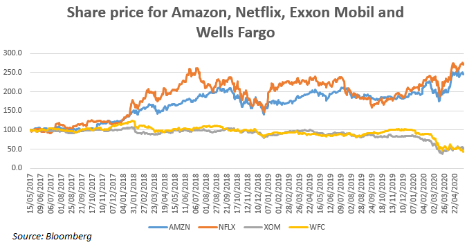 Beneath the surface, at the level of individual stock prices, there has been a lot more volatility. What has been fascinating to see is how many trends in the ‘real world’ have been sped-up by the pandemic and how this has, latterly, been reflected in stock prices. See chart, right, for two of the obvious ‘winners’ from the current malaise against an oil major and a bank, trends that were in place and have accelerated.