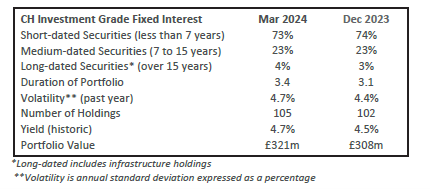 The Investment Grade Fixed Interest Fund was steady over a first quarter that turned out to be distinctly bumpy. The profile of the portfolio is little changed from the end of the year though the duration is slightly longer at 3.3 as we took advantage of some attractive new issues. All changes this quarter are show in the table, right.