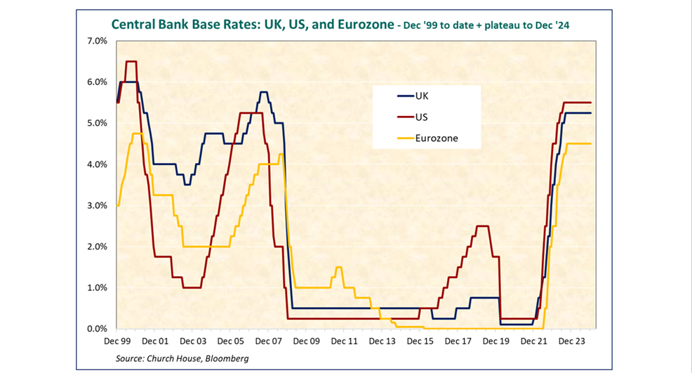 The effects of the rate increases of the past year are being felt more widely and economies are slowing, so it is correct for central banks to pause their rate increases now (“higher for longer” is the mantra), whether that plateau pattern for rates, as suggested on the chart above, holds is a moot point.
