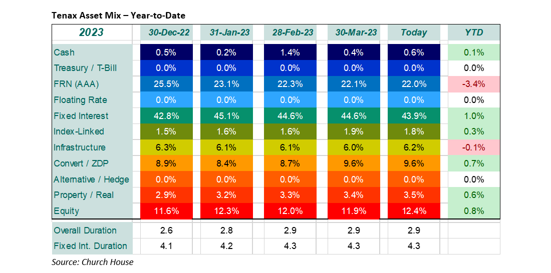 Within the Fund we have continued with the gradual shift from floating to fixed rate, still focussed on the short-dated end. We have also included a note of the overall duration and of the fixed interest proportion, which shows a modest increase, largely reflecting the shift to dated bonds (right, below).
