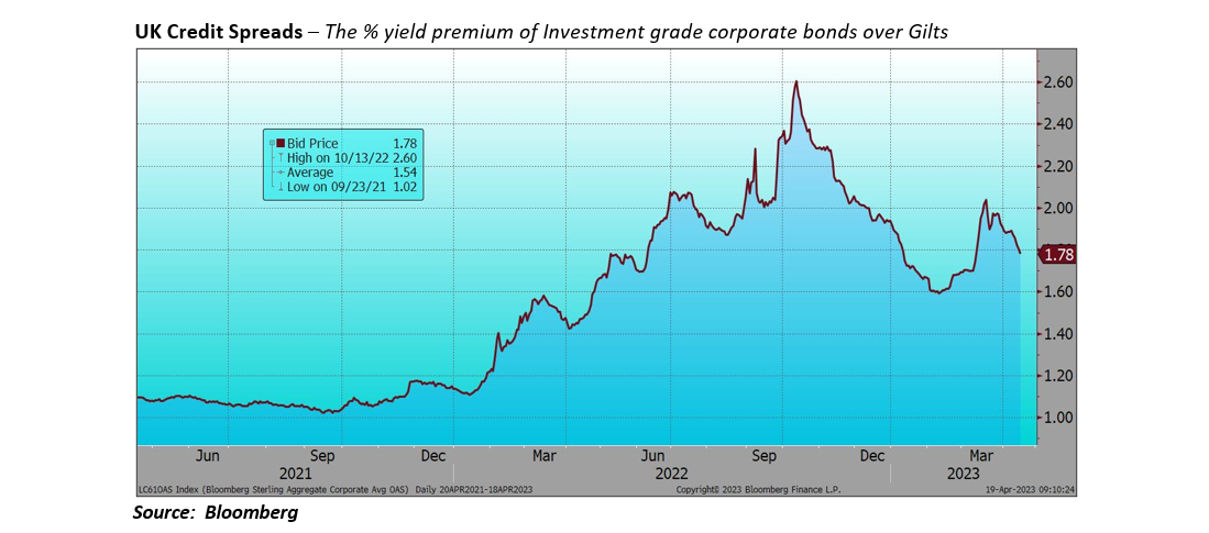 The ‘banking crisis’ has faded into the background somewhat but the impact will be felt in the availability of credit. Corporate credit spreads that spiked out again during the crisis are closing back in again (right).