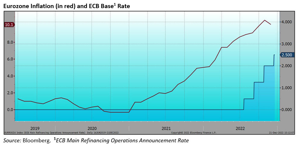 As mentioned, the Federal Reserve, ECB and Bank of England all raised their base interest rates by 50bp this month, earlier expectations had been for more 75bp increases. But another pleasant surprise from the US inflation figures for November, marking the fifth monthly decrease, tempered the Fed’s response. The Bank of England’s 50bp increase was accompanied by the rather discouraging note that two members of the Monetary Policy Committee had voted to leave rates unchanged at 3% and one had voted for an increase to 3.75% (it is a nine-person committee). It would appear that we are getting close to the peak in these rates, though further encouragement from the inflation figures on this side of the Atlantic would be helpful.
