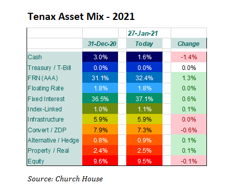 Trump’s histrionics and riots on Capitol Hill cost the Republicans control of the Senate with the loss of the two Georgian Senators. But it is not going to be plain sailing for President Biden, the Democrats’ control of the Senate is as thin as is possible and they lost seats in Congress. With volatility remaining at low levels, we have not undertaken any major shifts in asset allocation though we have been active in maintaining our cash/fixed profile. The table shows the modest changes to the overall asset mix, see right.