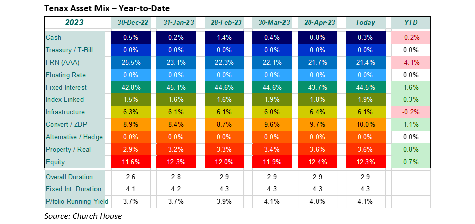 It has been a quiet period overall for equity markets with most leading indices down one to two per cent but further gains for the tech stocks that dominate the NASDAQ and for Japan. The equity positions in the Fund show encouraging gains for the ‘quality’ companies again, Halma being a feature over this period, though it is surprising to see a small fall for Diageo despite the announcement that Warren Buffet’s Berkshire Hathaway has established a stake in the company. Banks remain under a cloud, and we have seen some weakness in Lloyds and Standard Chartered. We are rebuilding some exposure to private equity, which we had sold out of in October 2021, with purchases of ICGT Enterprise, which now look startlingly good value after good figures.