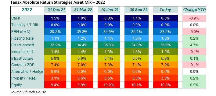 We have not made many changes in the other asset classes, considering that the opportunity in short-dated credit was the key consideration. Infrastructure has been hard hit by the move away from long duration assets and we have not made any more changes, considering that the investments we have are in a position to weather the storm. The Convertible holdings are unchanged while exposure to Zero Dividend Preference is reduced again following the maturity of a NB Private Equity issue. We have added slightly to Equity where opportunities are also emerging, notably amongst UK stocks.