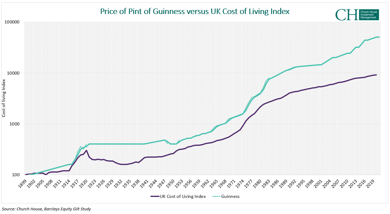 With the double whammy of double-digit inflation and rising interest rates, investors need to own businesses that have pricing power. As input costs rise, businesses must decide whether to stomach lower margins or raise the price of their products, and only the best can do the latter. One such business that has been doing this successfully for over 100 years is Diageo. From whatever product you look at inside Diageo’s copious portfolio you will find exceptional brands all with positive attributes for the world we’re in today. For example, the brand loyalty behind Guinness, means that our local pub, opposite the brand spanking new entrance to the Elizabeth Line, can charge £8.50 a pint, which customers will and do pay for (see our chart, right, for the beverage’s pricing power since 1899). Margins can equally be maintained in their gin, tequila and vodka divisions where they are distilled and sold in the US and then factoring in recent USD superiority then Scotch Whisky has never been so cheap for Diageo to sell into the States.