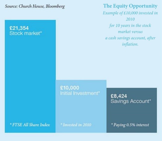 The graph, see right, shows historic returns of cash versus the stock market over the last 10 years. As an example, if you had invested £10,000 in the stock market in January 2010, it would have been worth £21,354 after 10 years. This assumes the re-investment of any dividend income and an adjustment for inflation. In a cash savings account paying an average of 0.5% interest over the same period, and again adjusted for inflation, the same investment would have been worth £8,424 after 10 years. And you thought cash was risk free!