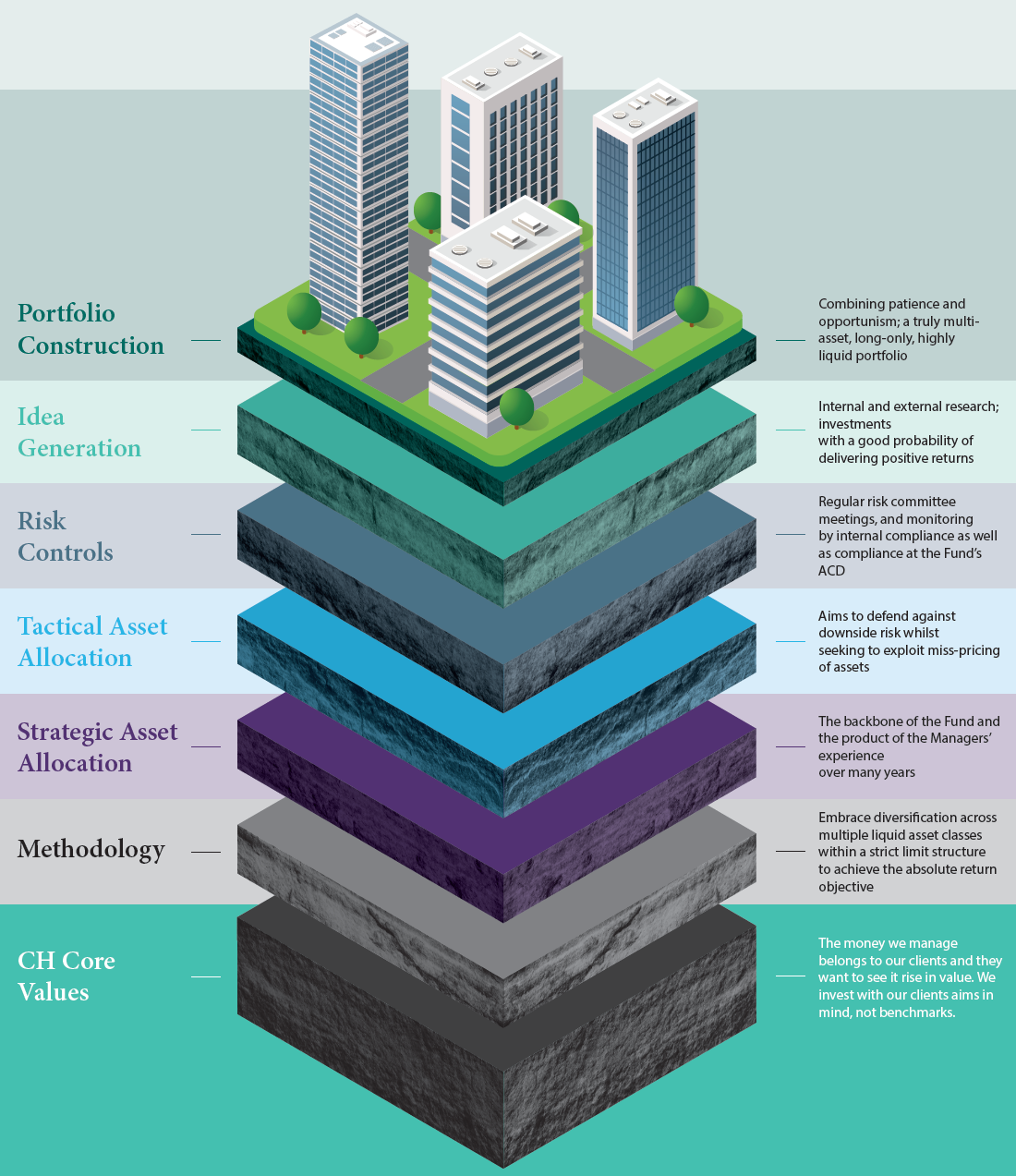 Idea generation is derived from tactical asset allocation, in turn leading to bottom-up, valuation-driven portfolio construction. It is a process that combines intuitive fund management skills with long-held, proven investment principles, and at its core is a constant awareness of the aims, objectives and risk tolerances of the Fund’s investors.